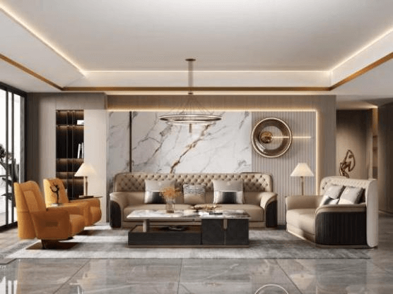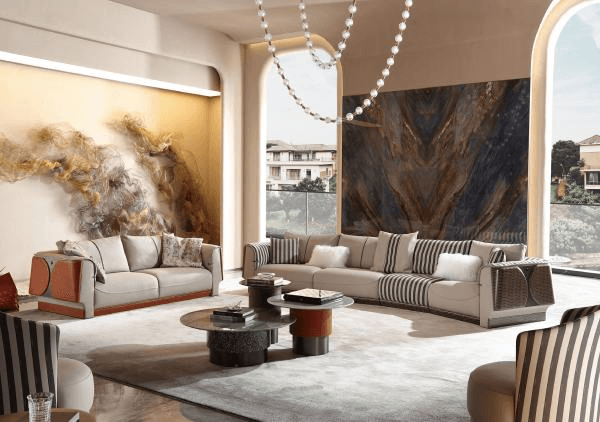 二者常以一深一浅的形式组合呈现,既不会过于厚重,又能彰显层次美学,尤其适合打造现代轻奢、意式极简风格类的家居,让客厅瞬间拥有精致考究的情调。