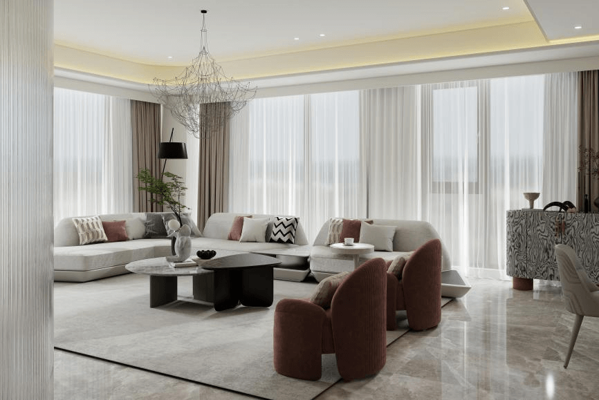 室内大面积应用柔美的弧线形家具,以温润轮廓和圆润边角为萌宠筑起安全结界,让家变得更柔软,避免它们跑动时磕碰受伤。