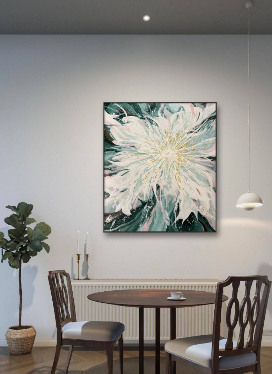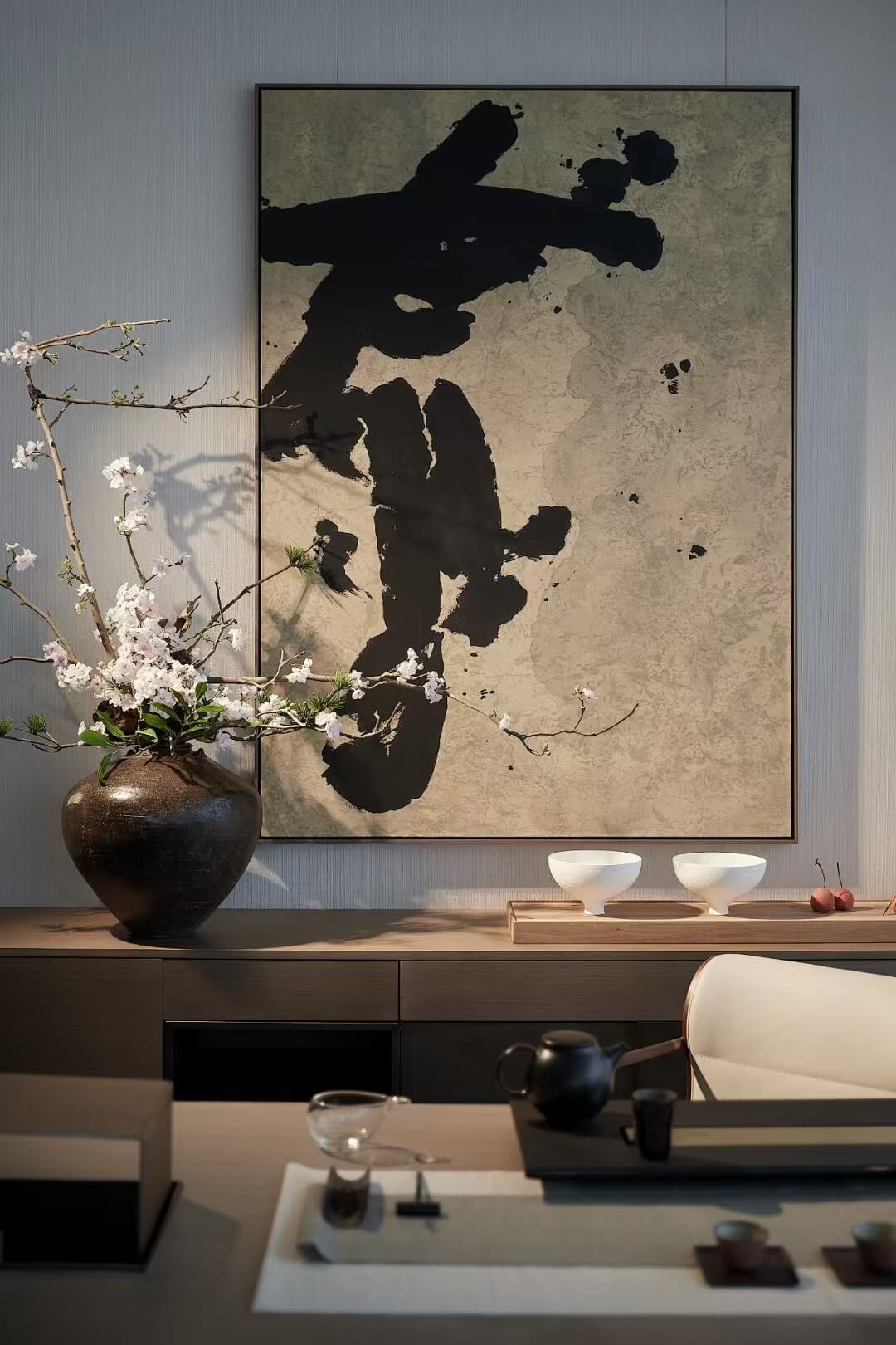 素白的墙面再点缀一幅装饰画,水墨字画、植物花卉等与自然木色相得益彰,为空间平添几分诗意与灵动意趣。