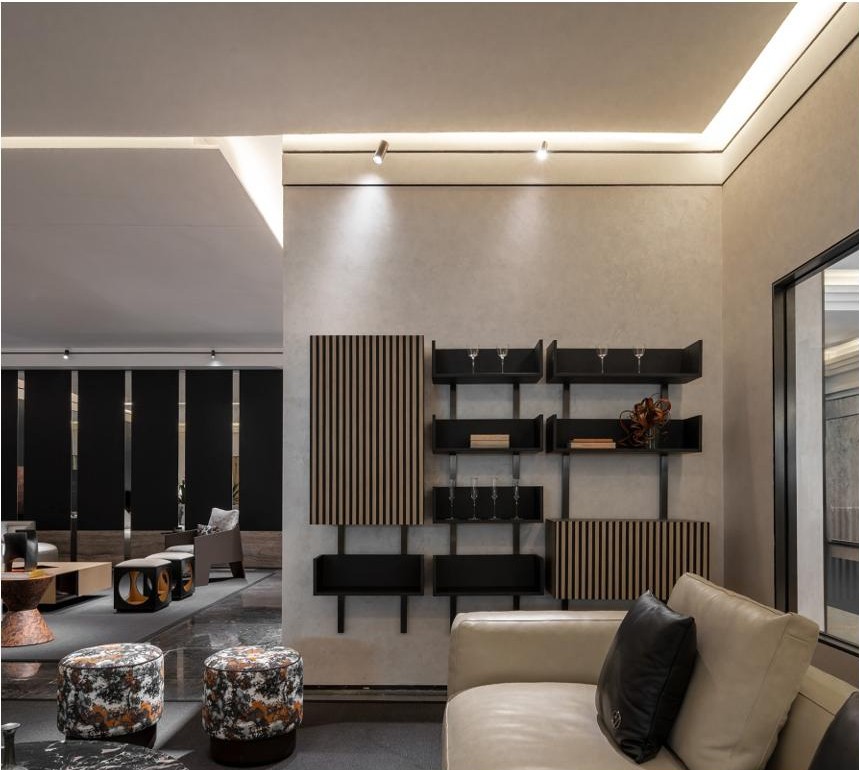 如果说内嵌收纳是“藏”的极致,悬浮收纳则是“露”的艺术。层板、搁架等统统上墙,将收纳空间向上延伸,这一设计特别适合用于展示书籍、摆件、艺术品等,营造出错落有致的美学效果,增强空间趣味,彰显居者品位。此外,悬浮设计在视觉上抬升了空间重心,能够为家带来更多呼吸感。