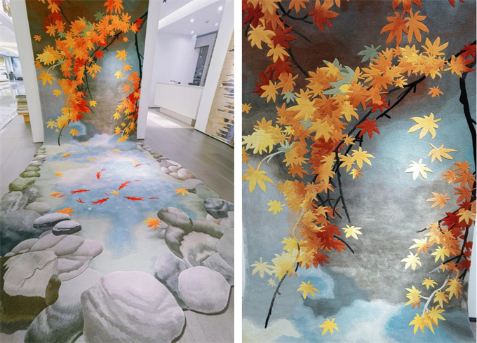 这款手工枪刺地毯以纯羊毛和真丝为材料,前后经十几道工序加工制作而成,品质上乘,彰显主人高雅的品位与格调。池中金鱼栩栩如生、清新自然,为家居空间注入无限活力,有效缓解了冬日的沉闷。