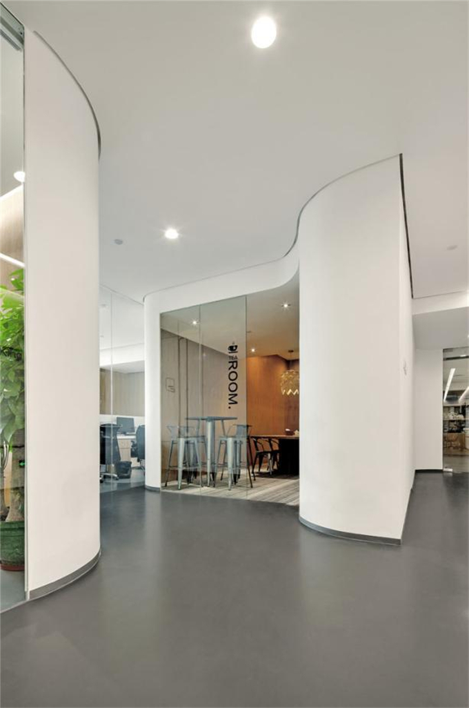 采用白蓝棕三色构成视觉语言,既沉稳又明亮,将会议室这个原本严肃的环境变得更有活力。茶水间被回旋隔断隔开,半推拉的玻璃门,高级又时尚。