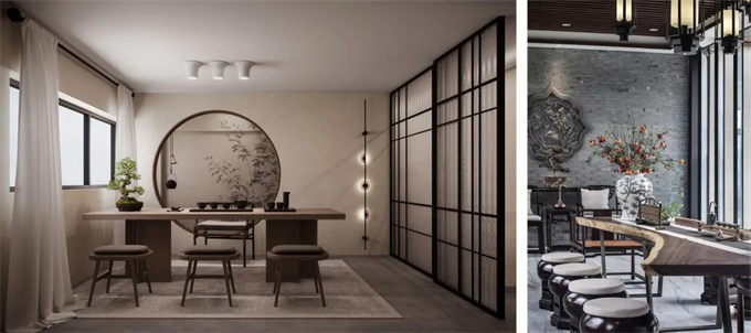 喝茶不仅是喝一种味道,更是体悟一种心境,因此,茶室空间的打造,讲究营造饮茶悠然风雅的生活情趣与自然山水恬静怡然的意境。