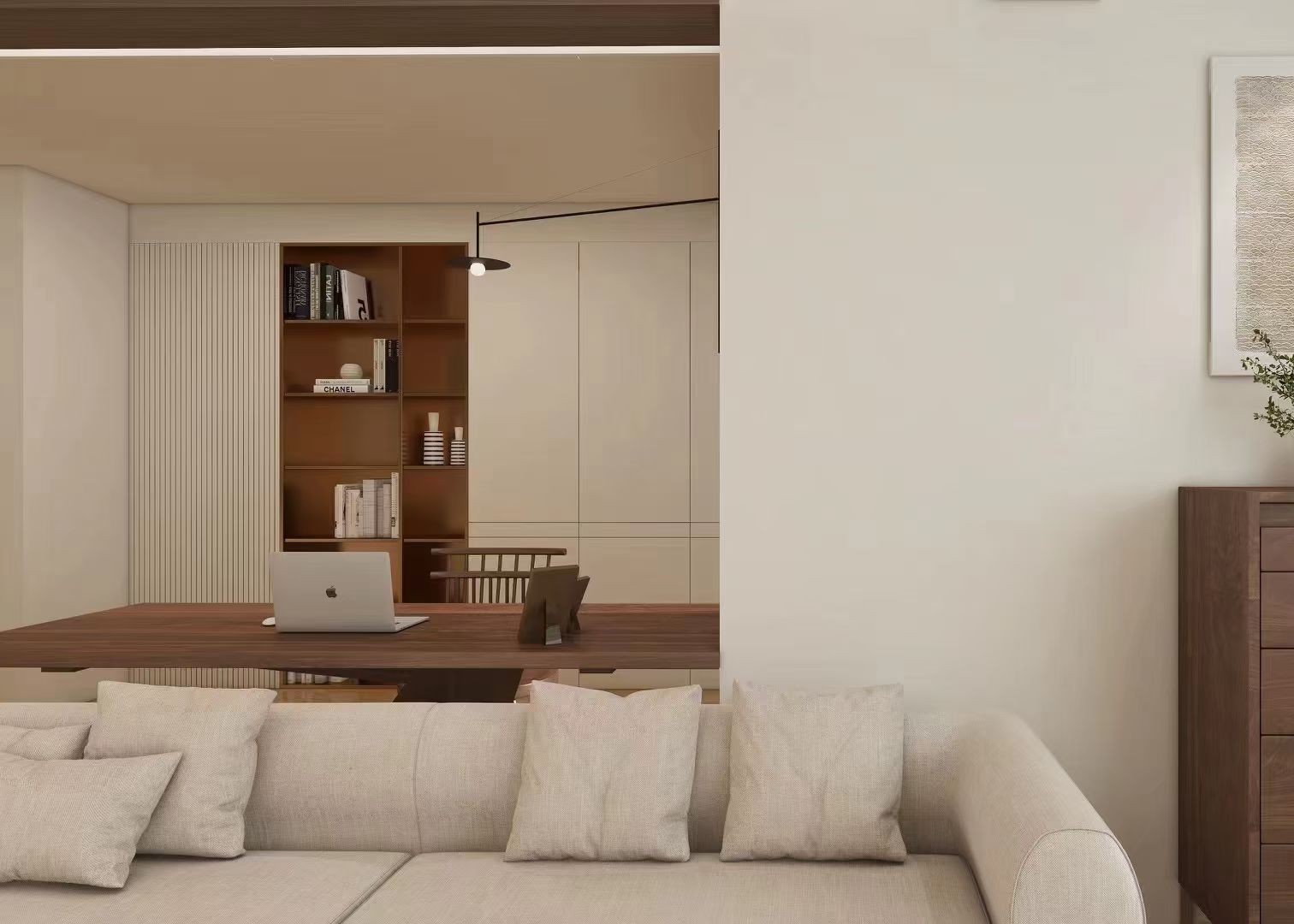 例如:通过将柜体、书架等嵌入非承重墙体,向内扩展空间,让庞大的储物空间悄然“隐身”,创造出平整利落的立面线条,增强空间的整体性和流畅感。