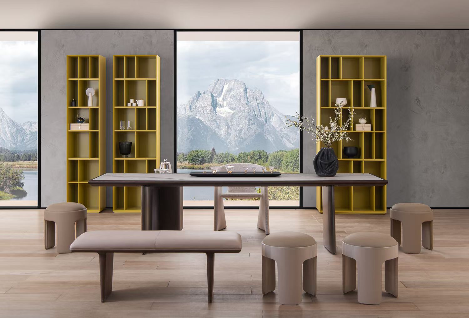除了简单的层板,造型独特、质感高级的置物架也能成为墙面收纳亮点,无论是几何造型的拼接,还是金属、原木等不同材质的碰撞,都能丰富空间美学层次。