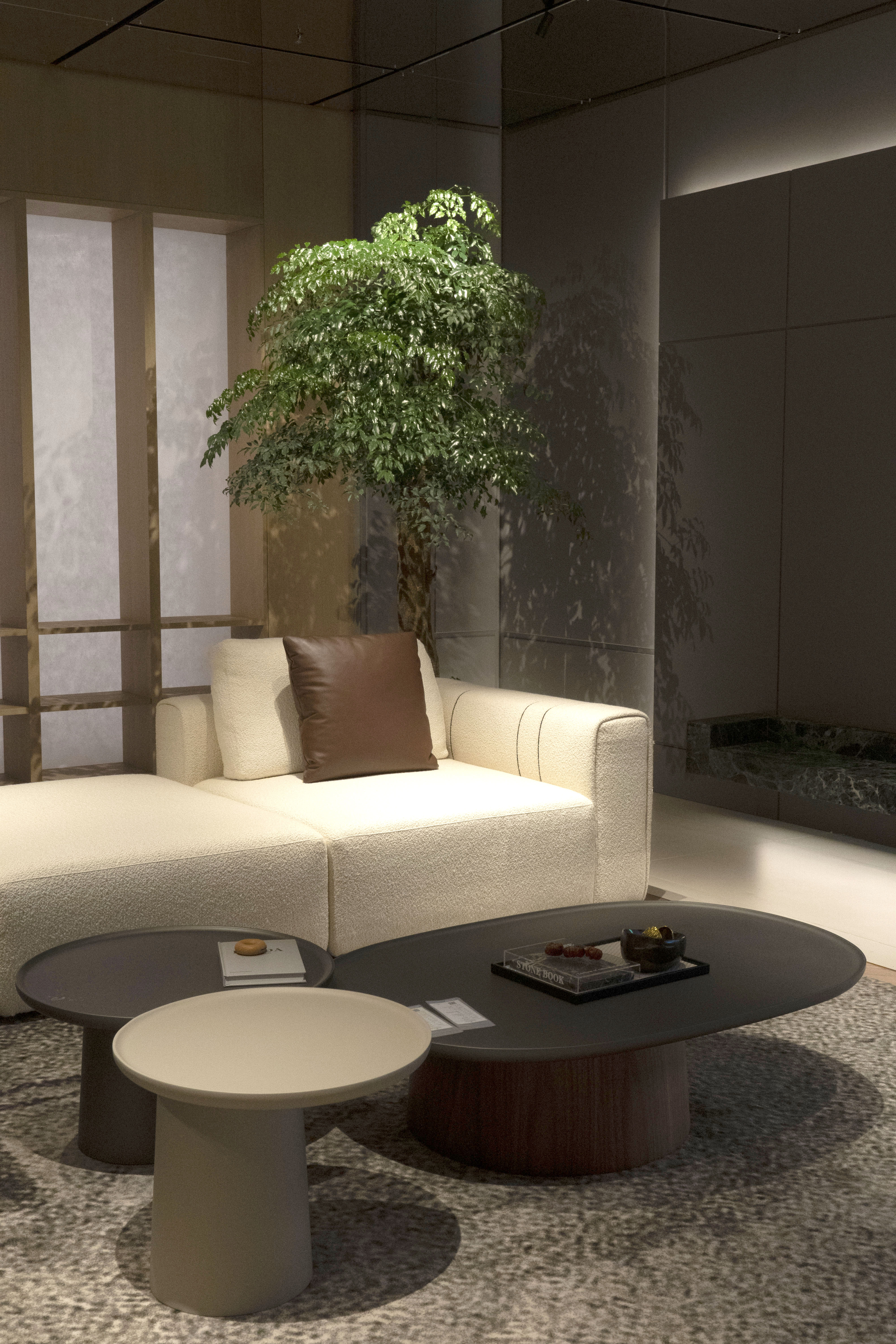 高低错落的组合形式,既满足随手置物的需求,又打破空间的单调。大理石台面温润易清洁,金属脚架纤细精致,细节处见品位。