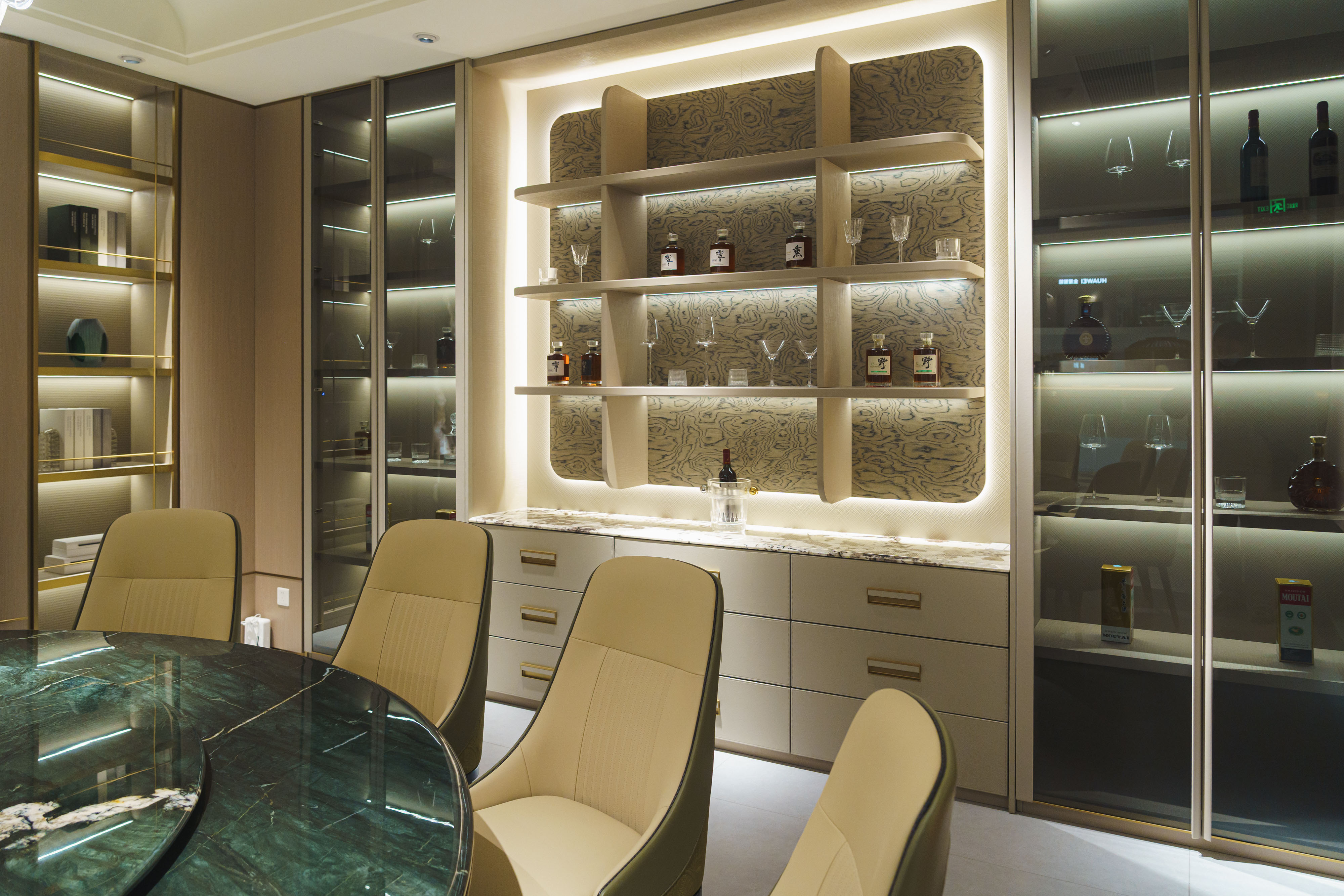 不是简单的背景装饰,而是集收纳、展示、影音于一体的系统设计。封闭柜门藏起杂乱,开放格展示藏品,暗藏灯带烘托氛围。
