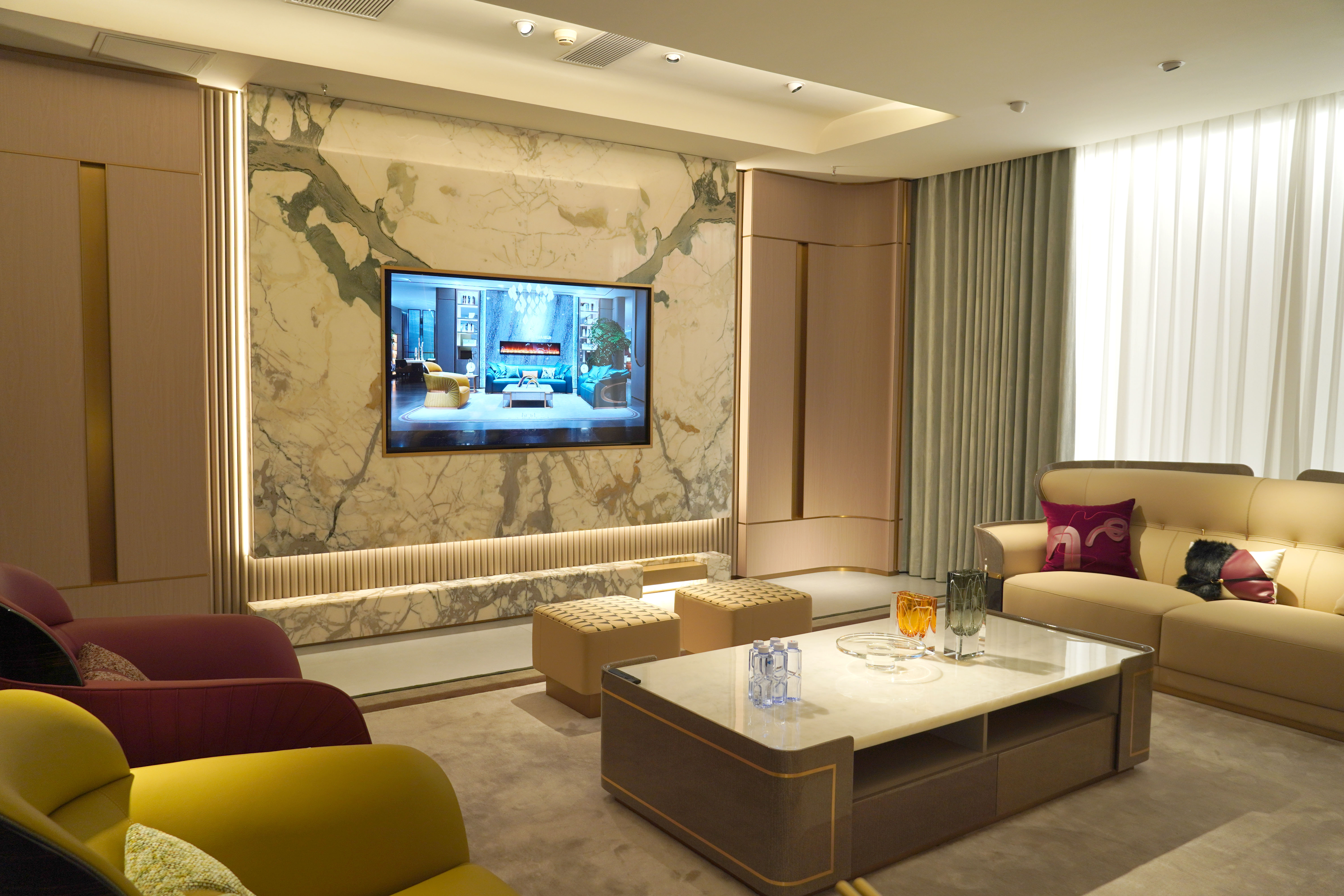 佛山罗浮宫家居全案定制优势: 从沙发到电视墙,从地毯到窗帘,客厅所有元素统一设计、统一选材、统一落地,杜绝“沙发好看背景墙不搭”的尴尬。